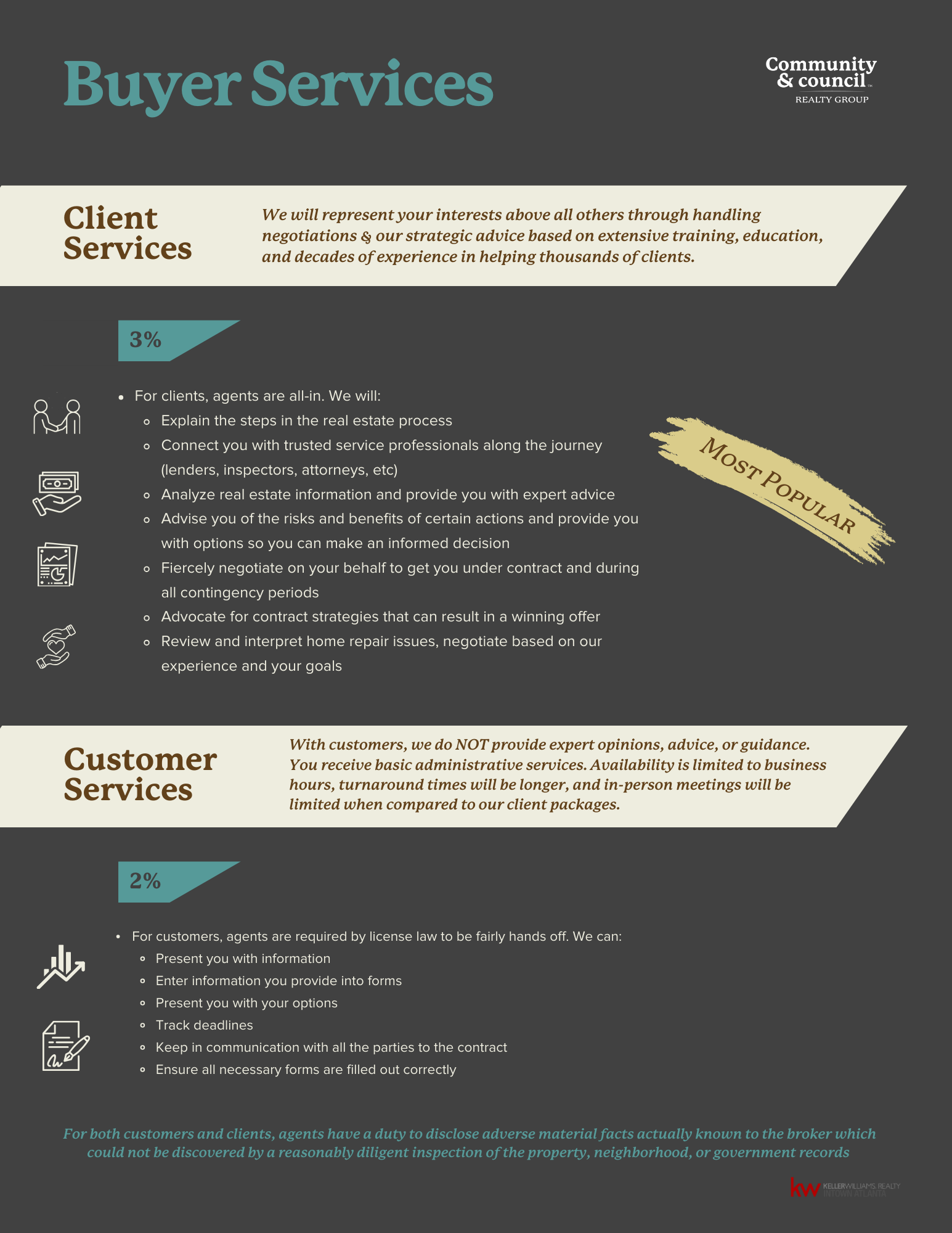 C&C’s primary guiding principles are our commitment to transparency and personalized service throughout the home purchase and sale process. To achieve this, we have developed a Menu of Services for both the buying and selling process that detail our service packages, compensation for each package, and our commitment to offering the personalized service your deserve. We understand that each situation is unique and believe with our Menu of Service all of our customer and clients will receive a level-up in service that allows them to Feel at Home.
